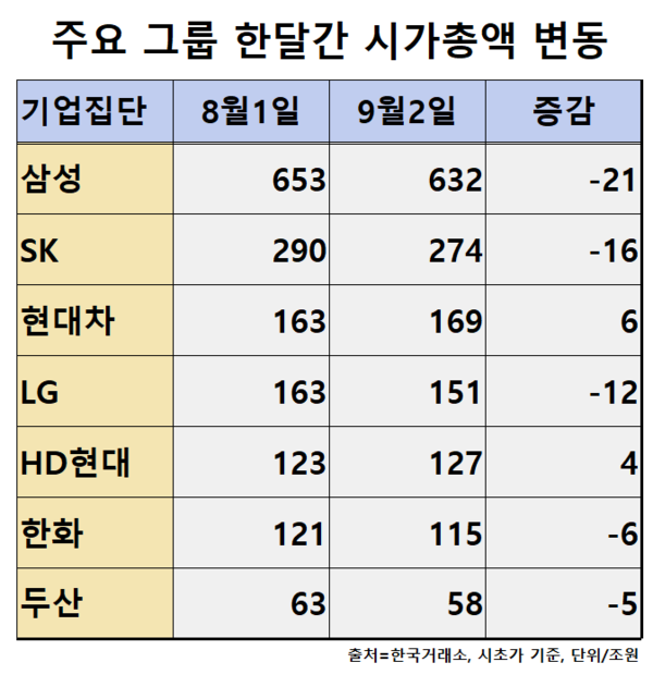 LG그룹은 163조원에서 151조원으로 12조원 줄었다. LG전자와 LG화학 등 주력 계열사의 실적 부진과 업황 악화 전망으로 주가 약세다. LG화학의 경우 정부가 업황 위기 대응을 위한 산업 재편 방안을 발표했지만 주가 하락세를 바꾸지 못했다.