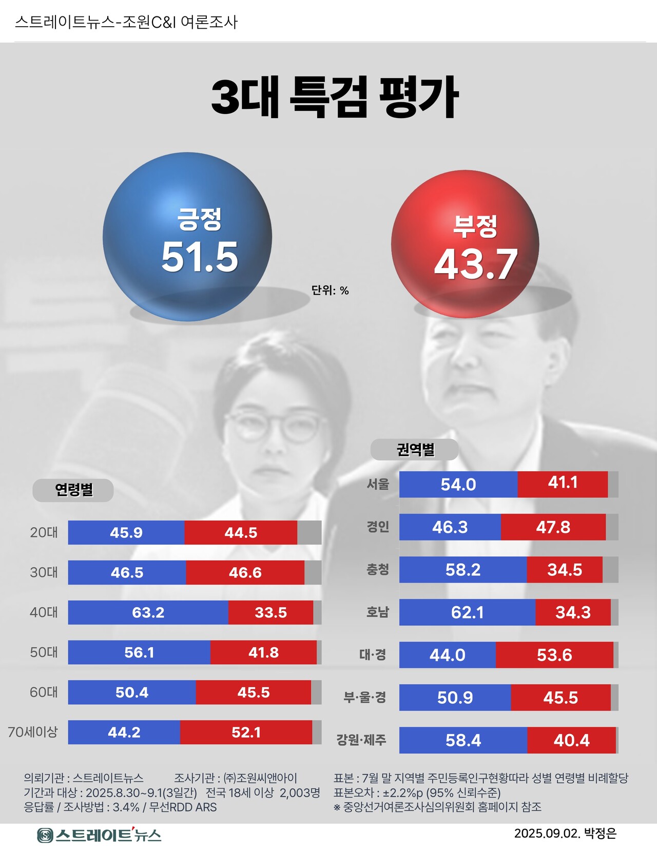 <스트레이트뉴스>가 여론조사기관 조원씨앤아이에 의뢰해 8월 30일부터 9월 1일까지 전국 만 18세 이상 남녀 2003명을 대상으로 '3대 특검'에 대해 어떻게 평가하느냐고 물어본 조사에서 '긍정' 평가는 51.5%, '부정' 평가는 43.7%로 찬성이 7.8%포이트 우세했다.