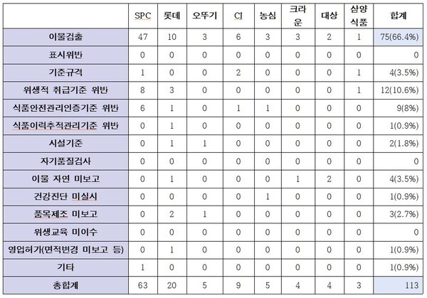 이 가운데 SPC는 63건으로 가장 많아 불명예 1위를 기록했다. 주요 위반 사례가 발생한 곳은 경기 시흥 삼립 시화공장이었다. 모두 이물질 혼입으로 적발됐으며 △머리카락 6건 △비닐 4건 △탄화물 3건 △실 2건 등 다양한 사례가 보고됐다.