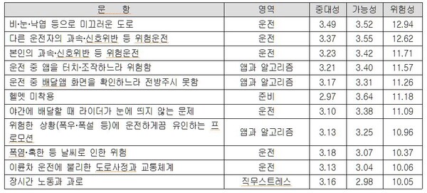 또한 △헬멧 미착용 △야간 시야 확보 문제 △폭염·혹한 등 기상 조건 △이륜차 도로체계 불리 △장시간 노동과 과로도 높은 위험성을 기록했다.