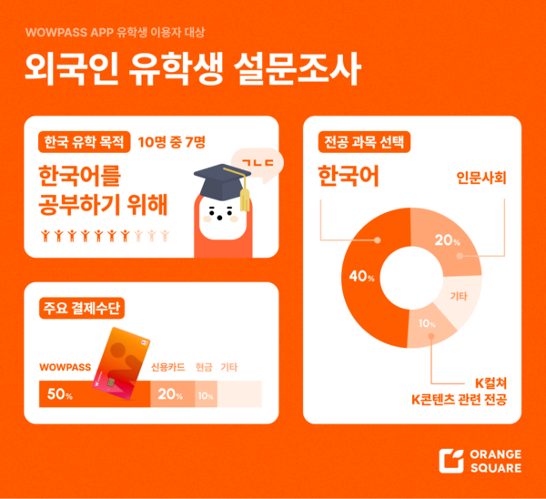 오렌지스퀘어는 자체 운영 중인 방한 외국인 전용 올인원 결제 플랫폼 와우패(WOWPASS) 앱에서 올해 상반기 유학생 회원을 대상으로 설문조사를 진행했다.