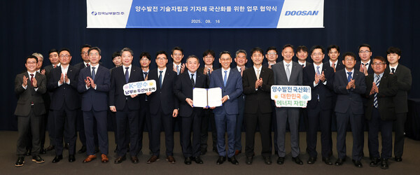 정연인 두산에너빌리티 부회장은 "최근 양수발전소 건설이 증가하면서 주기기 설계 및 제작 기술 자립의 필요성이 커졌다"며 "남부발전의 실증 환경 제공 덕분에 양수발전 기자재 국산화 속도를 더욱 높일 수 있을 것"이라고 말했다.