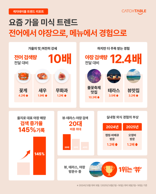 이번 리포트는 2024년과 2025년 각각 8~9월 캐치테이블 앱 내 검색 데이터를 기반으로 했다. 분석 결과, 소비자들의 외식 관심사가 단순히 메뉴 선택을 넘어 ‘공간’과 ‘경험’으로 확장되는 흐름이 뚜렷하게 나타났다.
