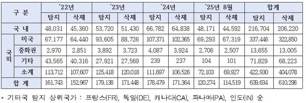 연도별 탐지 건수는 △2022년 16만1,743건 △2023년 17만9,138건 △2024년 17만8479건으로 매년 증가 추세다. 올해(2025년)는 8월까지 이미 12만274건이 탐지돼, 연말까지 지난해 수치를 넘어설 것으로 예상된다.