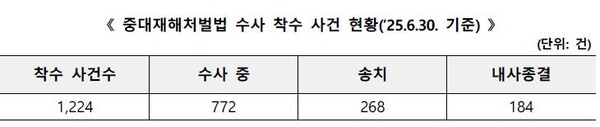 29일 국회 환경노동위원회 소속 윤상현 국민의힘 의원(인천 동구·미추홀구을)이 고용노동부로부터 제출받은 '중대산업재해 수사 착수 사건 현황'에 따르면, 중대재해처벌법 시행 이후 올해 6월 30일까지 총 1224건의 수사가 진행됐지만, 이 중 유죄 확정은 15건(1.2%), 실형 선고는 1건(0.08%)에 그쳤다.
