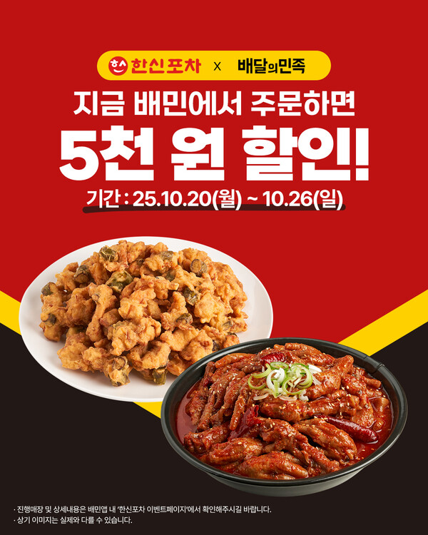 더본코리아 한신포차가 오는 20일부터 26일까지 배달앱 배달의민족에서 주문 시 5000원 할인 혜택을 제공하는 프로모션을 진행한다.
