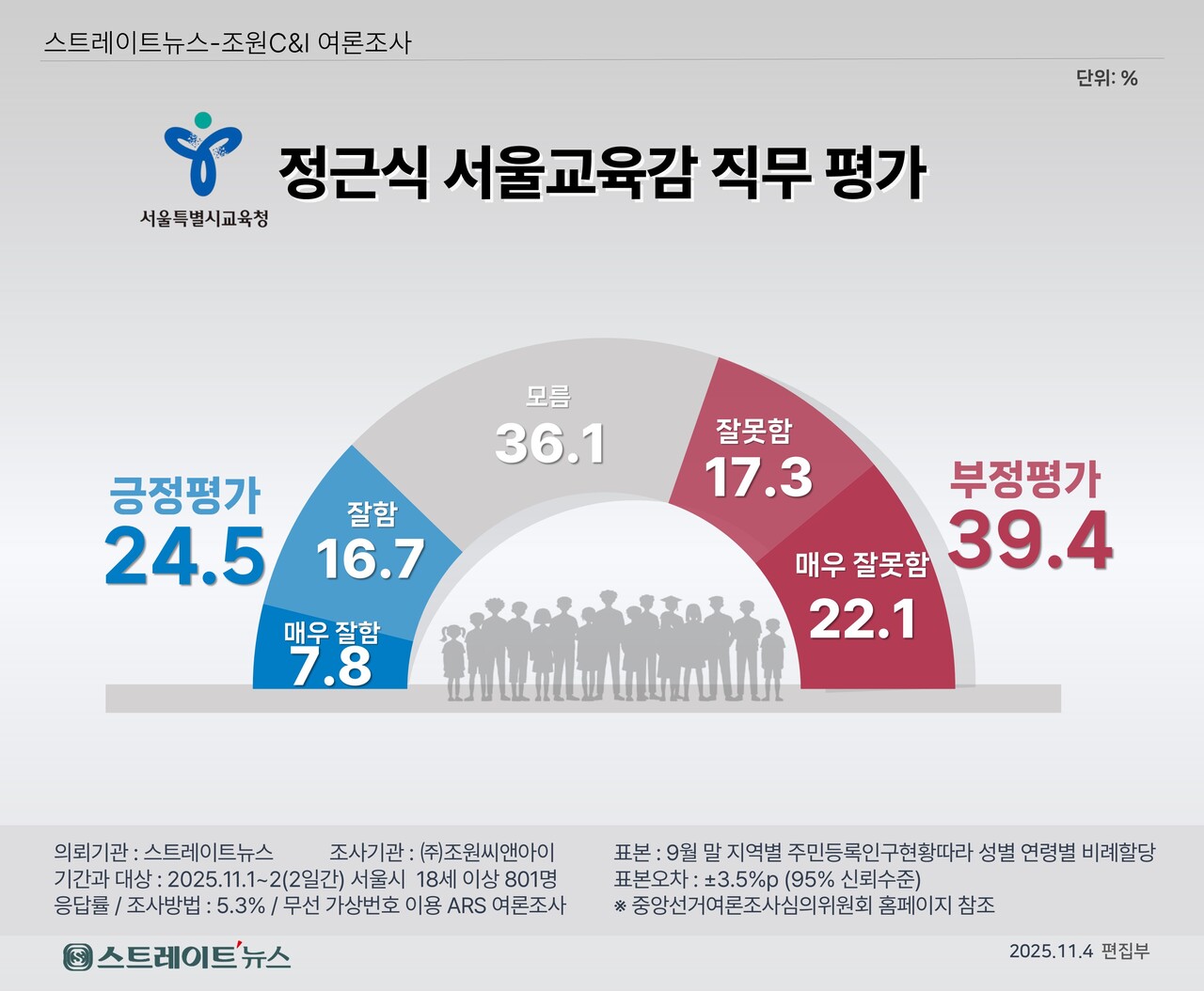 스트레이트뉴스 의뢰로 조원씨앤아이가 11월 1~2일 이틀간 서울 거주 만 18세 이상 남녀 801명을 대상으로 조사한 결과, 정 교육감의 직무 수행에 대해 긍정 24.5% vs 부정 39.4%로 집계됐다.
