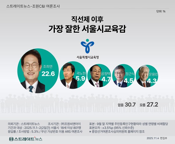 이번 조사에서는 서울시민이 직선제 이후 가장 잘한 교육감으로 조희연(22.6%)을 꼽았다. 이어 곽노현 6.9%, 공정택 4.7%, 정근식 4.5%, 문용린 4.3%의 순이다. 반면 '없다'가 27.9%, '모름'이 37.0%로 절반 이상을 차지했다.