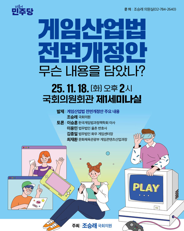 더불어민주당조승래 의원(대전 유성구갑, 더불어민주당)은 오는 18일 오후 2시 국회 의원회관 제1세미나실에서 '게임산업법 전면개정안, 무슨 내용을 담았나?' 토론회를 개최한다고 밝혔다.