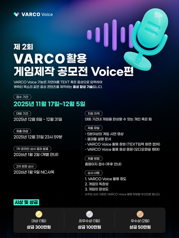 심사는 바르코 보이스 활용도, 게임의 독창성, 완성도를 기준으로 진행되며, 총상금 규모는 500만 원이다. 1차 온라인 심사는 내년 1월 2일, 2차 현장 심사는 1월 9일 열린다. 이번 공모전은 지난해 ‘바르코 3D’에 이은 두 번째 시리즈로, 인공지능이 창작의 영역을 확장하는 국내 대표 공모전으로 주목받고 있다.