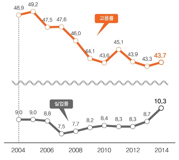 2 0 14년 기준 서울시 청년( 2 0 - 2 9세) 실업률은10.3%로 역대 최고치를 기록했고, 2005년 49.2% 수준이던 고용률은 10년 만에 43.7% 수준으로 낮아졌다.