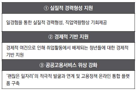 청년기는 ‘기회의 균등함’과 ‘더 나은 삶의 조건으로의 이행 가능성’을 필요로 한다. 따라서 사회적 관계로부터 멀어지고 있는 청년들에게 적절한 경험과 숙련, 관계형성과 참여의 기회를 제공하고 괜찮은 일자리로의 이행을 지원하는 공공의 적극적 역할이 요구 된다.