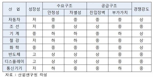 산업연구원은 수출과 생산을 주도하는 산업이 대기업의 비중이 높다는 것은 특정 업체의 경영전략이나 수익성에 의해 산업 전체에 영향을 미칠 가능성이 높음을 의미한다고 설명했다.