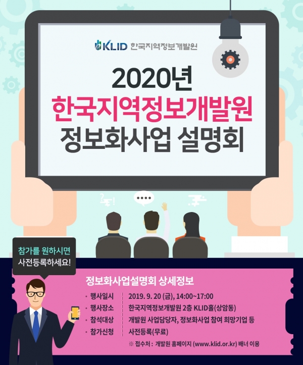 한국지역정보개발원(원장 지대범, 이하 KLID)은 20일 오후 2시 서울 상암동 청사(2층 KLID홀에서 ‘2020년도 정보화사업 설명회’를 개최한다고 18일 밝혔다.