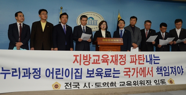 이들은 이날 오후 국회 정론관에서 기자회견을 열고 "지방 교육 재정의 파탄과 지방교육 자치의 붕괴를 막을 막중한 책임을 느끼며 2016년도 누리과정 어린이집 보육료 부분에 대한 예산 심의를 거부키로 했다"고 밝혔다.