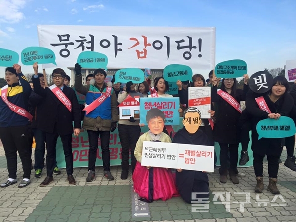 그들은 다름 아닌 청년·대학생 1천여 명이 모인 네트워크 단체인 ‘헬조선을 구하라, 청년혁명’(아래 청년혁명)으로 ‘청년살리기 10대 법안 10만 서명운동’ 시작을 선포하고 기자회견을 여는 중이었다.
