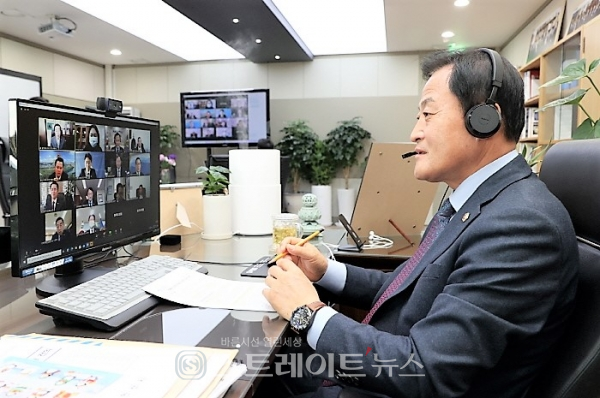경기도의회 장현국(더민주, 수원7) 의장이 8일 오전 의장 집무실에서 전국 광역의회 의장들과 함께한 화상회의에서 ‘지방자치법 전부개정법률안’ 연내 국회통과의 중요성을 강하게 주장했다.