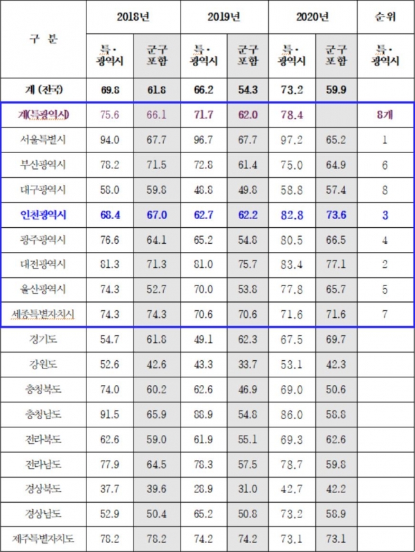 인천시는 2019년까지 하위권(전국 10위, 특광역시 7위)에 머물렀으나, 2020년 12월말 원문정보(3급 이상 결재문서) 공개율이 정보공개 포털에서 82.8%(19,607건 중 16,233건)로 전국 17개 시·도 중 전국 4위, 특·광역시 중 3위로 올라섰다.