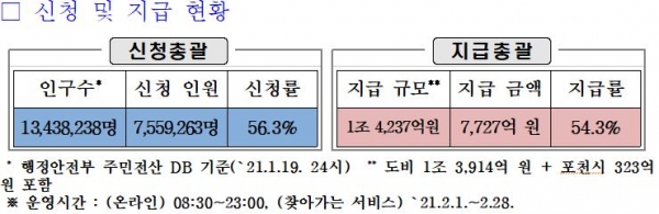 8일 경기도에 따르면 지난 1일부터 7일 23시까지 2차 경기도 재난기본소득 신청을 한 경기도민은 755만 9,263명으로 집계됐다. 이는 경기도 전체 인구 1,343만 8,238명의 56.3%에 해당하는 수치다.