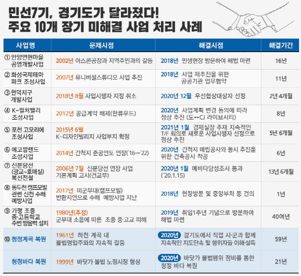 오랜 기간 동안의 어려움을 딛고 새로운 국면을 맞거나 해결된 민선7기 경기도의 주요 장기미해결사업 처리 사례들을 살펴봤다.