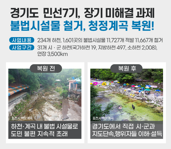 여름이면 반복되는 바가지요금, 불법쓰레기 등으로 대변됐던 하천 계곡 불법 점유와 시설물 문제는 수십 년 동안 반복돼 당연한 것처럼 여겨졌던 장기미제였다. 그러나 설득과 보상, 단호한 행정집행이라는 경기도의 1년여 동안의 노력으로 말 그대로 청정계곡 복원이라는 성과를 얻었다.