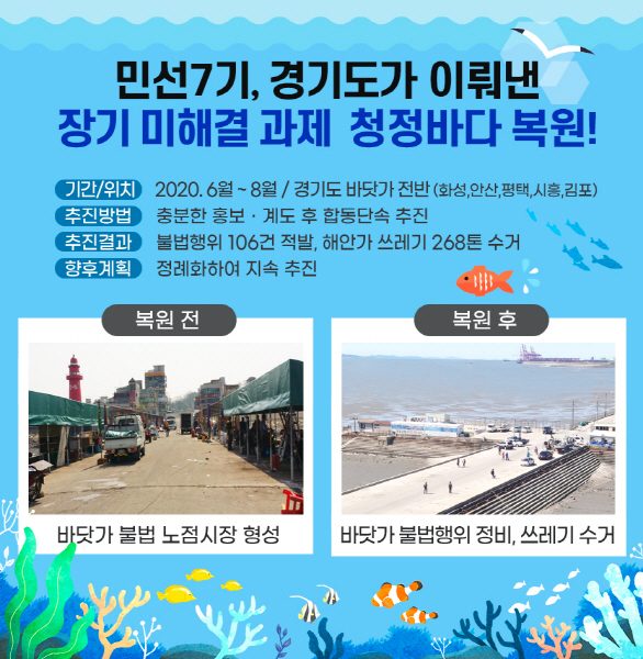 경기도는 현재 청정계곡에 이어 청정바다만들기 사업도 추진 중이다. 경기도는 지난해 7월부터 궁평·제부·방아머리 등 도내 해수욕장과 전곡항, 궁평항 등 도내 33개 항·포구 등을 대상으로 불법 파라솔 설치 행위 등을 단속했다. 이어 시흥시 오이도항의 불법 컨테이너 철거 등 어항 정비를 했다. 경기도와 시흥시는 철거한 불법 컨테이너 부지에 수산물직매장을 설치해 적법하게 운영할 수 있도록 했다. 도는 2022년까지 시흥시 오이도에 국비 66억 원 등 총 94억 원을 투입해 어항 기반시설 정비하고, 오이도를 시흥갯골습지, 월곶항, 시화호 거북섬을 잇는 수도권의 중심 관광지로 개발한다.
