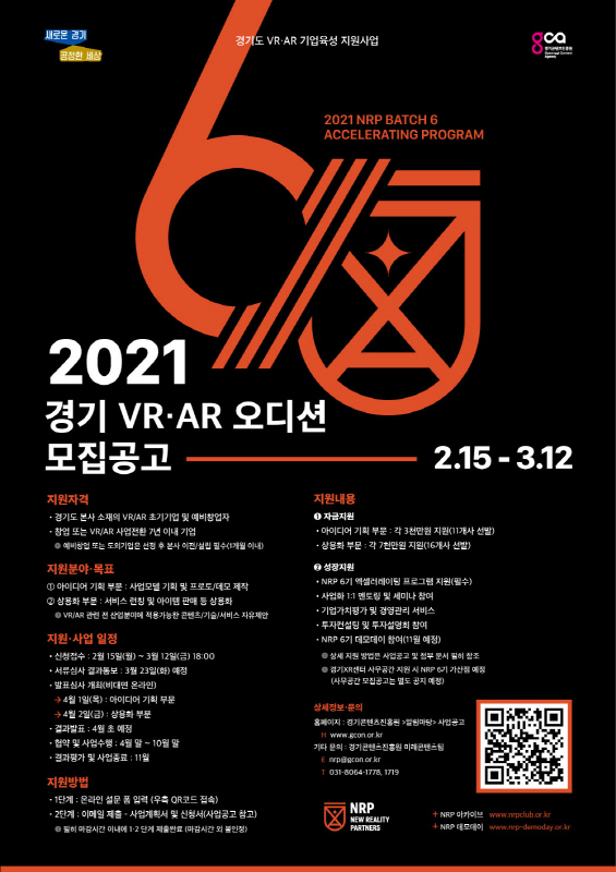 이 밖에 수원 광교에 위치한 ‘경기 XR(eXtended Reality, 가상 및 증강현실을 포함한 확장현실 실감 콘텐츠)센터’에서 가상/증강현실 개발에 필요한 시설과 장비도 무상으로 사용할 수 있으며, 추후 사무공간 입주기업 모집 시 가산점도 부여받게 된다.