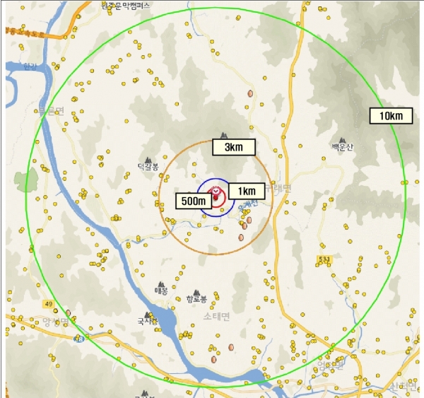 방역대내 농가는 ▲1km 이내 토종닭 1호 20수 ▲1~3km 내 닭, 거위, 칠면조 농가17호 147수 ▲3~10km 내 114호 10만 8,082수로 총 132호 10만 8,249수가 분포돼 있다.