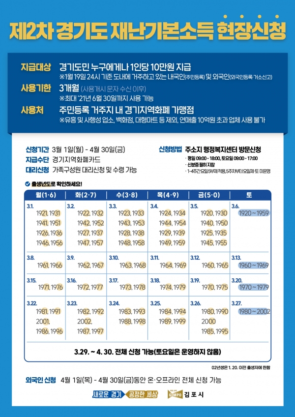 [스트레이트뉴스=조황재 기자] 김포시는 3월 1일부터 4월 30일까지 읍·면·동 행정복지센터에서 '제2차 경기도 재난기본소득 현장접수'를 진행한다고 밝혔다. 지급대상은 1월 19일 24시 기준 경기도에 주소지를 둔 경기도민이며 외국인도 포함된다.